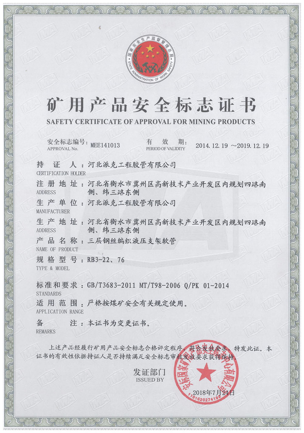 三層鋼絲編織液壓支架軟管證書(shū)